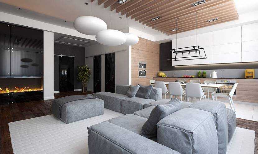 Большой зал с кухней и каминомИсточник comfortoria.ru