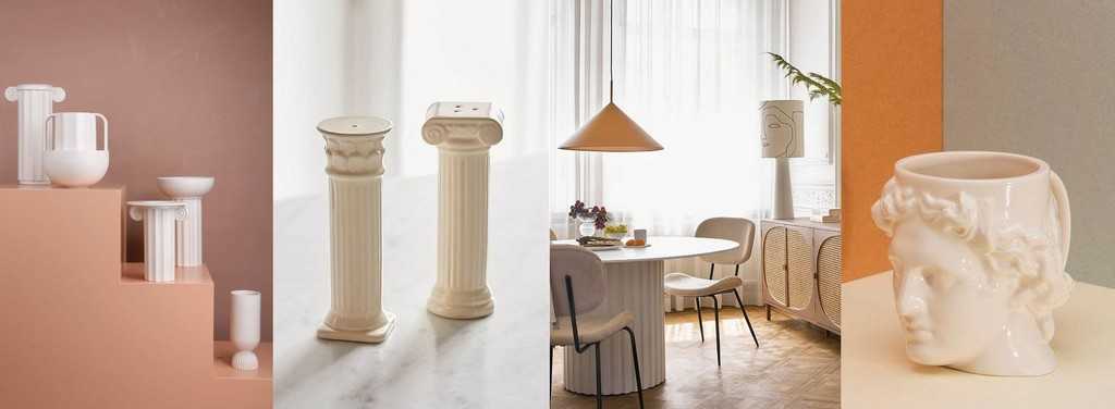 Декор в духе античности. Посуда, чаши, вазы, бюсты и даже элементы мебели, напоминающие о гомеровских временах, будут уместны не только в классическом, но и в современном интерьере.