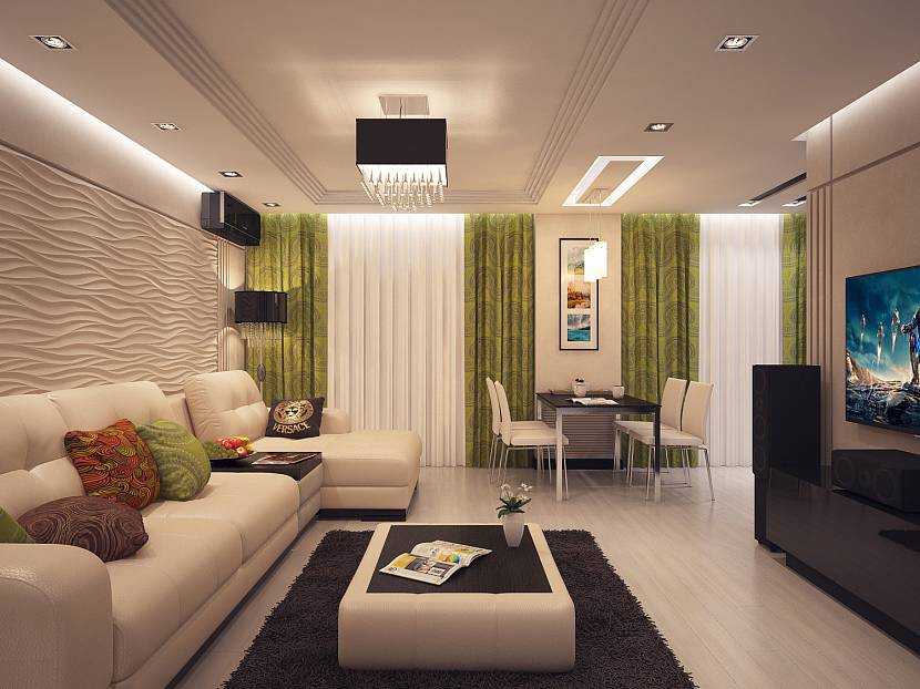 В зал можно установить «стенку», где будет размещаться телевизор, красивая посуда и элементы декора. Фактура штор на окнах должна гармонировать с обивкой мебели, что придаст помещению утонченности и подчеркнет вкус ее хозяев. В большой комнате можно дополнительно установить полки, чего нежелательно делать в помещении маленькой площади. Меблировать гостиную желательно многофункциональной мебелью, которая будет комфортно и практично использоваться в будни и праздники.