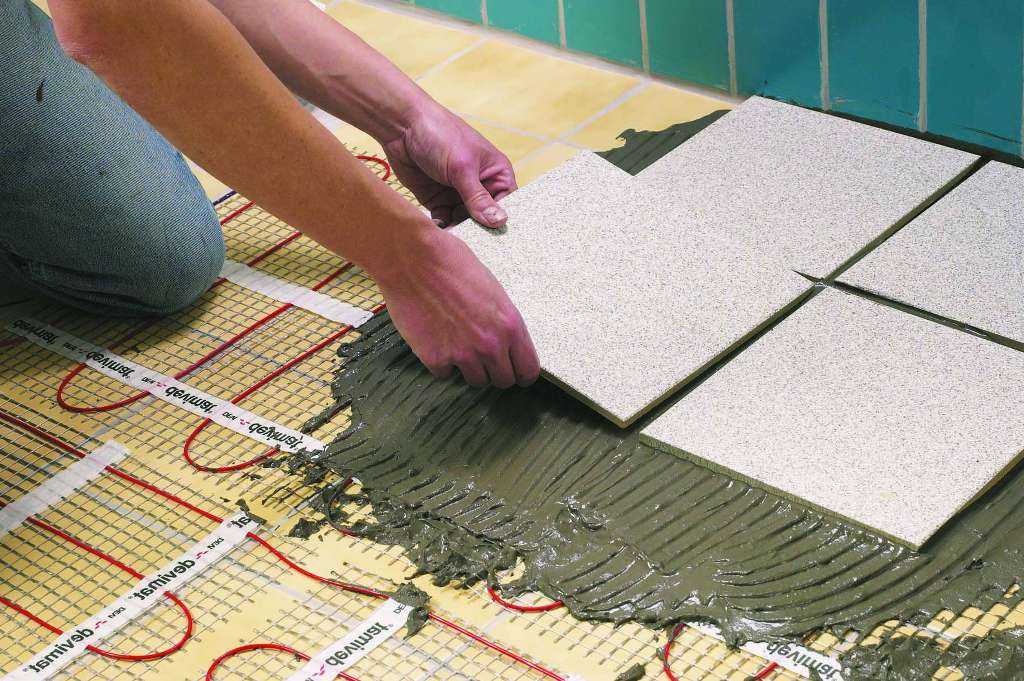 Для укладки плитки нужно использовать специальный клей для теплого пола. Он должен выдерживать температуру 50-60 градусов. Специалисты советуют предварительно затянуть нагревательный мат тонким слоем плиточного клея. Это нужно сделать для того, чтобы в процессе укладки плитки не повредить кабель. После полного высыхания можно дальше укладывать плитку.