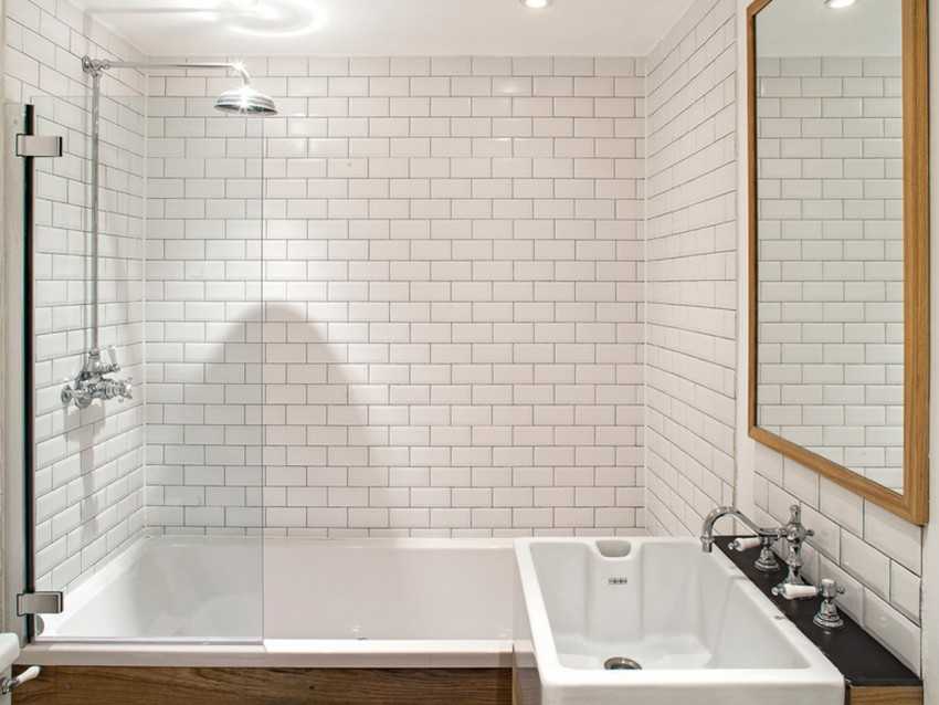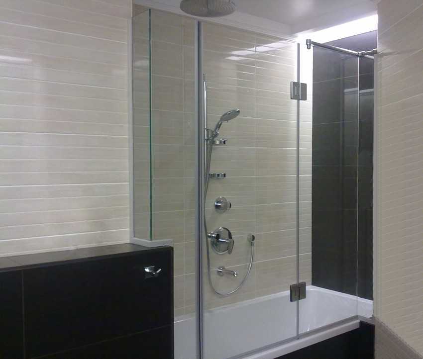 Для маленьких помещений душ и ванная соединяются в одну конструкцию. Тогда переборка крепится к стенке и краю ванной. Здесь размеры могут быть уменьшены до 0,5-0,7 м по ширине и 1,5 м в высоту.