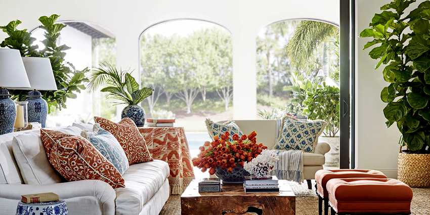 - Связывание. Гармоничным интерьер получается, если предметы связаны цветом или фактурой. Например, такие разные вещи, как столик барокко и современный диван отлично уживутся благодаря декоративным подушкам и салфеткам одного цвета, или цветочный принт на кресле повторяет рисунок на вазе.