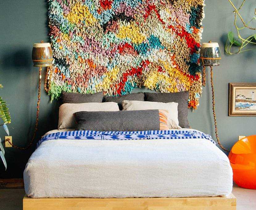 Спальня в стиле бохо с декором в виде разноцветного ковролина на стенеИсточник servantoff.ru