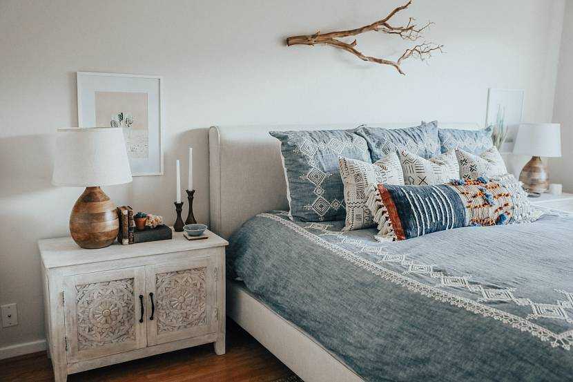 Спальня в стиле бохо с большой кроватью и состаренной прикроватной тумбочкойИсточник itsmejd.com