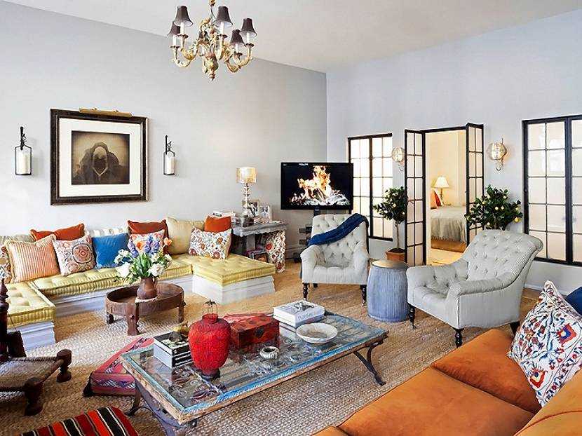 Основу эклектичной гостиной представляют предметы мягкой мебели, выгодно разбавленные аксессуарами и винтажными элементами, например массивными комодами, шкафами, полками или буфетами
