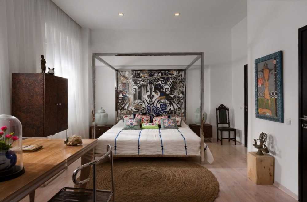 На фото просторная спальня с интерьером, выдержанным в эклектичном стиле.
