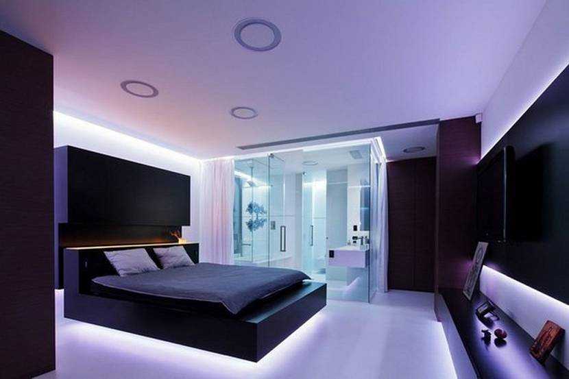 Уютная спальня в бело-пурпурной гамме с декоративной неоновой подсветкой