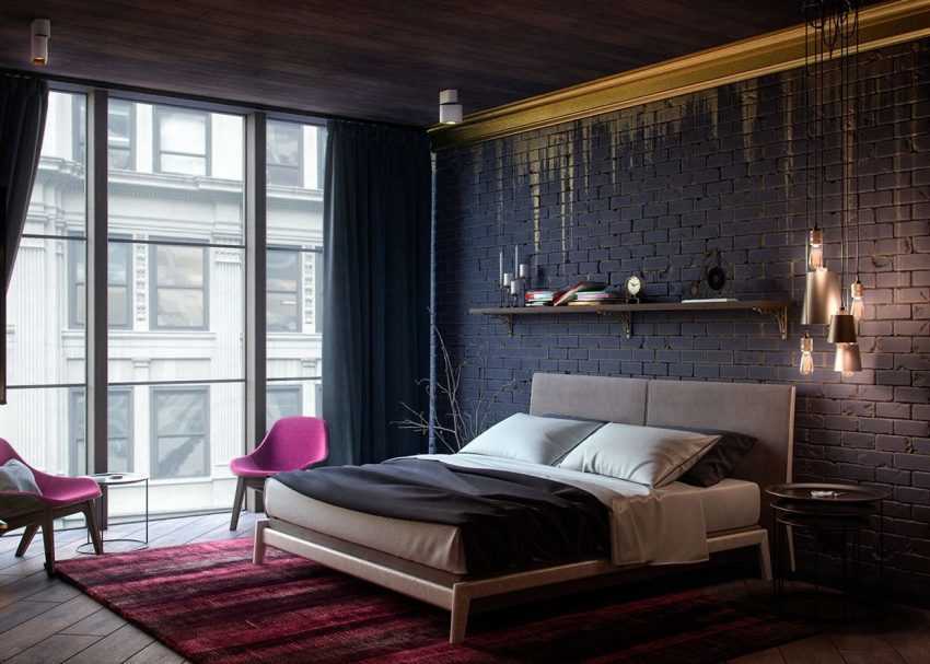 Довольно редко, но от этого не менее эффектно, делают один акцент за изголовьем, а второй – в зоне туалетного столика, интерьерной ниши или гардеробной.