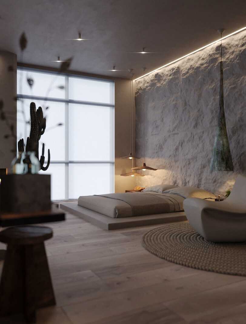 Спальня в минималистическом стиле – бесподобна. Функциональность требует, чтобы это было царство сна и все дизайнерские решения подчинены этой цели. Главный герой – низкая, широкая кровать на платформе.