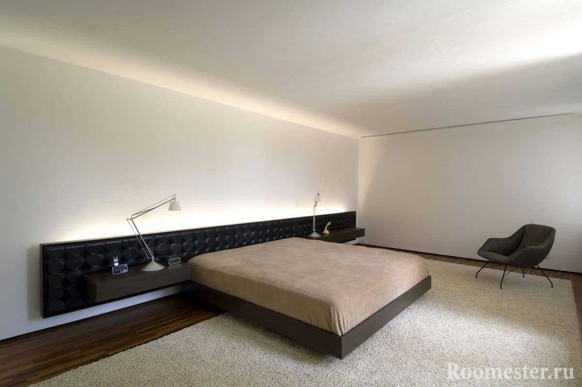 В просторных спальных комнатах помимо спального места можно организовать уголок для отдыха, все предметы и элементы для которого следует подобрать в соответствии с требованиями минималистического направления. Для этого подойдет небольшой ковер нейтральных оттенков без рисунка, возле которого можно поместить удобное кресло в сдержанном дизайне. Возле кресла можно поставить небольшой журнальный столик правильной геометрической формы, а в качестве источника освещения подойдет обычный торшер.