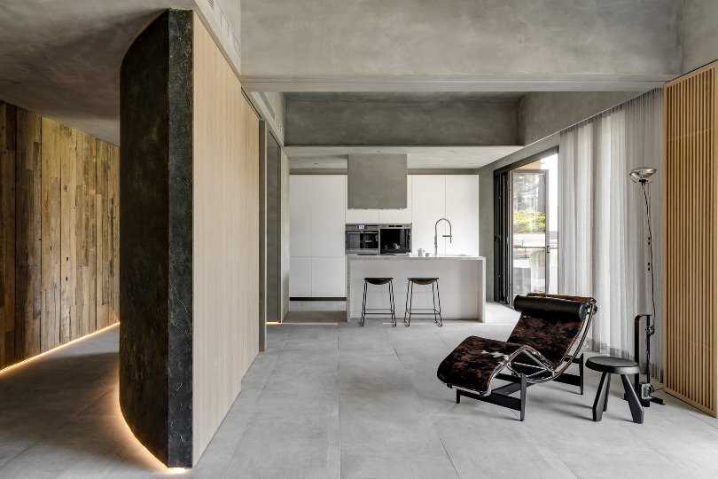 ФОТО: otdelkasten.comСочетание бетонных и деревянных поверхностей красиво смотрится при оформлении квартиры в стиле минимализм