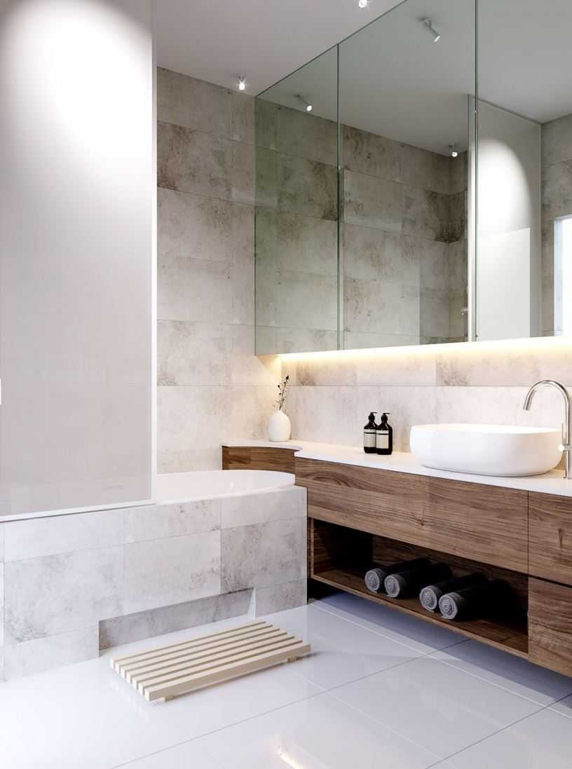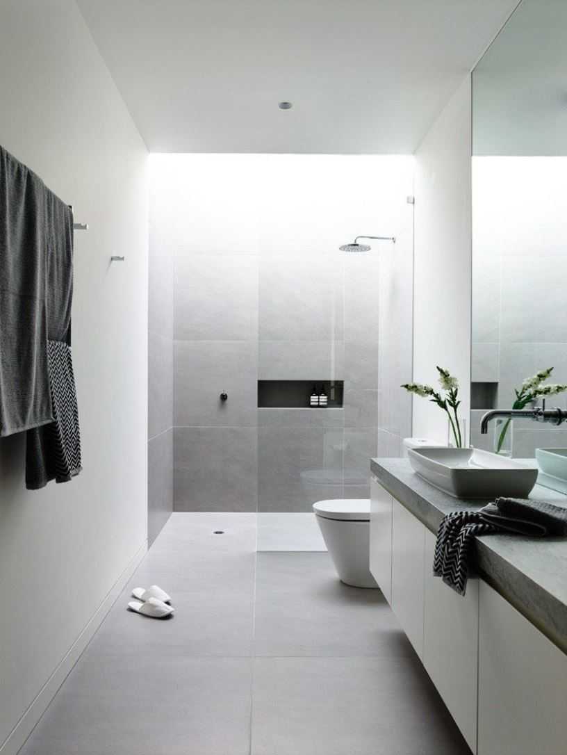 Палитра материалов для гостиной может быть ограничена главным образом бетоном и стеклом. Бетон обеспечивает текстуру, интерес к минималистскому дизайну интерьера. Текстура, зернистость плитки сочетается с простой нейтральной палитрой в современной ванной комнате.