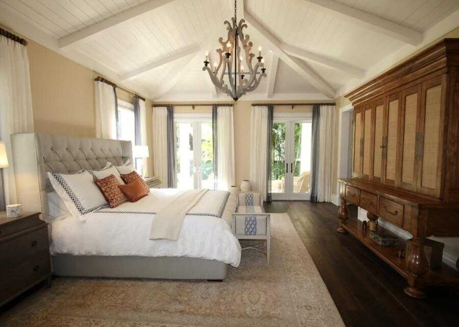 Отделку этой комнаты предпочтительно выполнить в светлых, например, молочных, тонах с вкраплением деревянной фактуры в окнах, потолочных балках, колоннах и т.п. Пол также лучше отделать грубыми досками. Камин устанавливается как натуральный, так и искусственный. Мебель приобретается из деревянного массива – отлично смотрятся роскошная резная кровать и комод в едином стиле. На полу в зоне кровати расстелите ковер или мех животного. Текстиль подбирается светлых тонов из натуральных материалов: хлопок, лён, шерсть, а также мех. Люстру под потолком уравновешивают аккуратные торшеры по бокам кровати. На стенах висят картины или фото, дополняющие антураж альпийского домика.