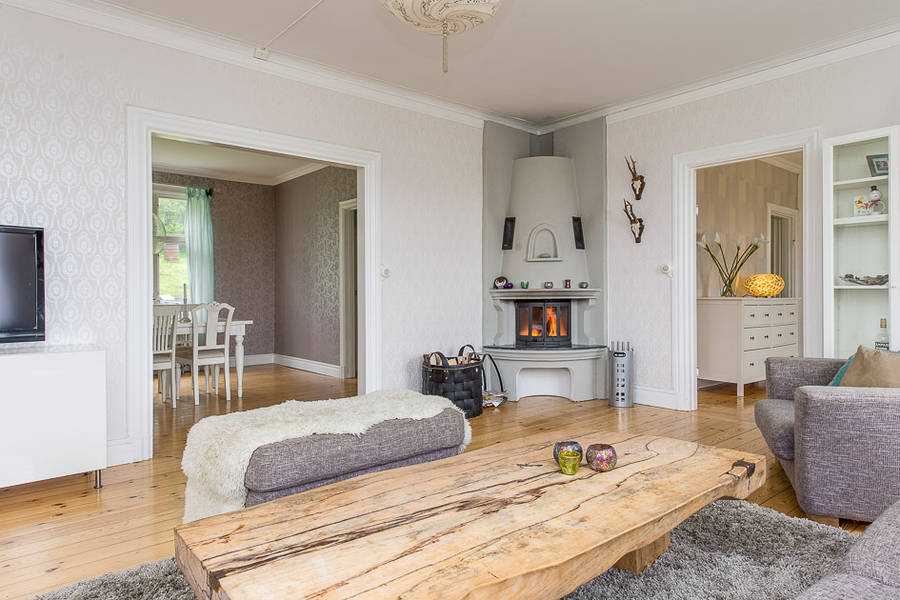 В гостиных, расположенных на первом этаже, каменные стены могут быть обшиты доской или дощатыми панелями либо оштукатурены (фактурная штукатурка). Деревянные стены верхних этажей обычно не подвергаются дополнительной отделке – осуществляется лишь обработка дерева.