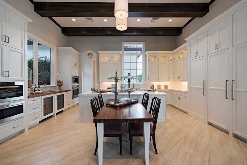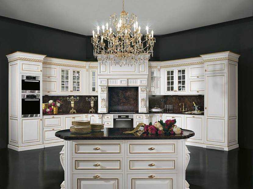 Неоклассический интерьер кухни предполагает использование отделочных материалов высокого качества: роскошный мрамор, благородное дерево, изящное стекло
