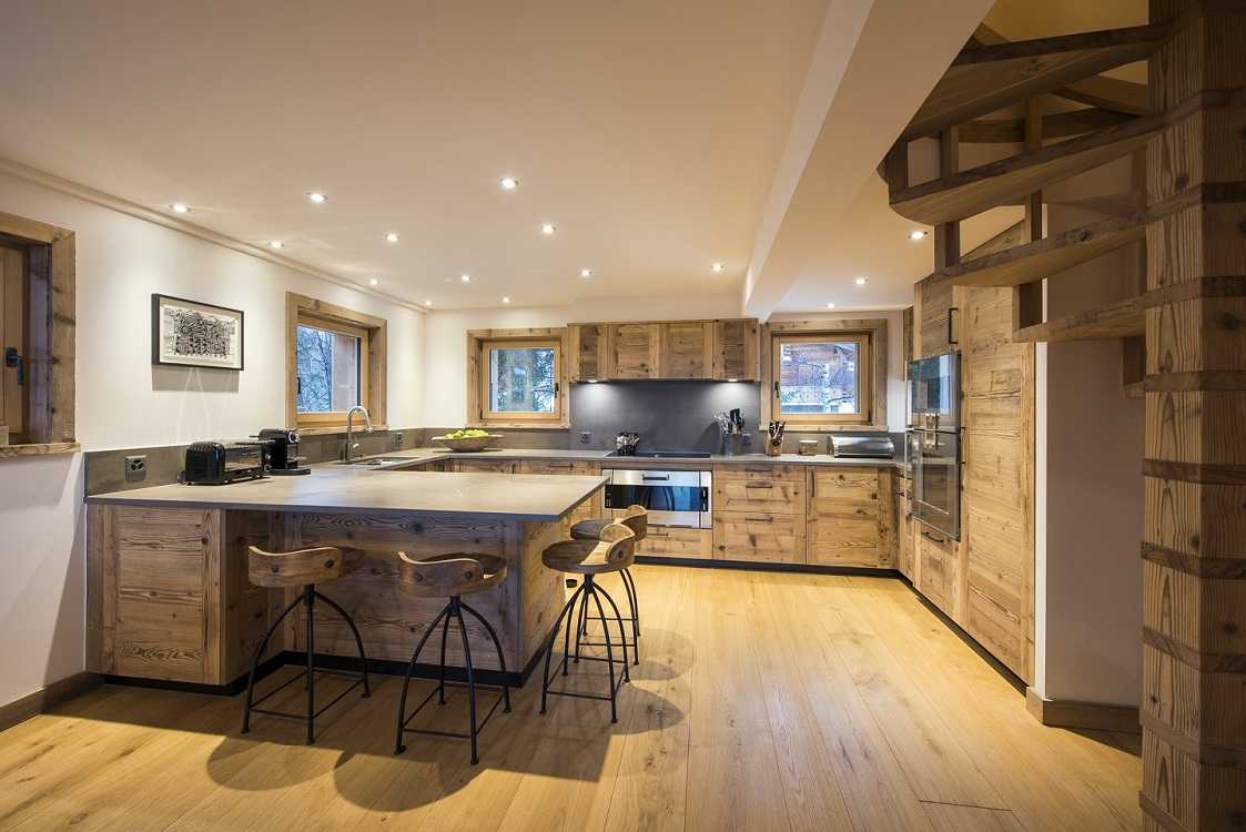 В качестве покрытия преимущественно натуральное дерево в виде широких досок или паркета. В реальности подобная модель не всегда доступна. Поэтому можно создать имитацию древесины с помощью качественного ламината со структурой и приближенным к природному оттенком.