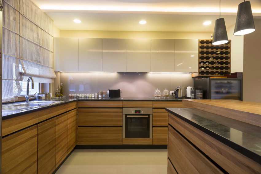 - Максимальное освещение – вместо традиционной люстры в центре комнаты появились более удобные и эргономичные прожекторы, которые можно размещать по периферии кухни и даже мебели.