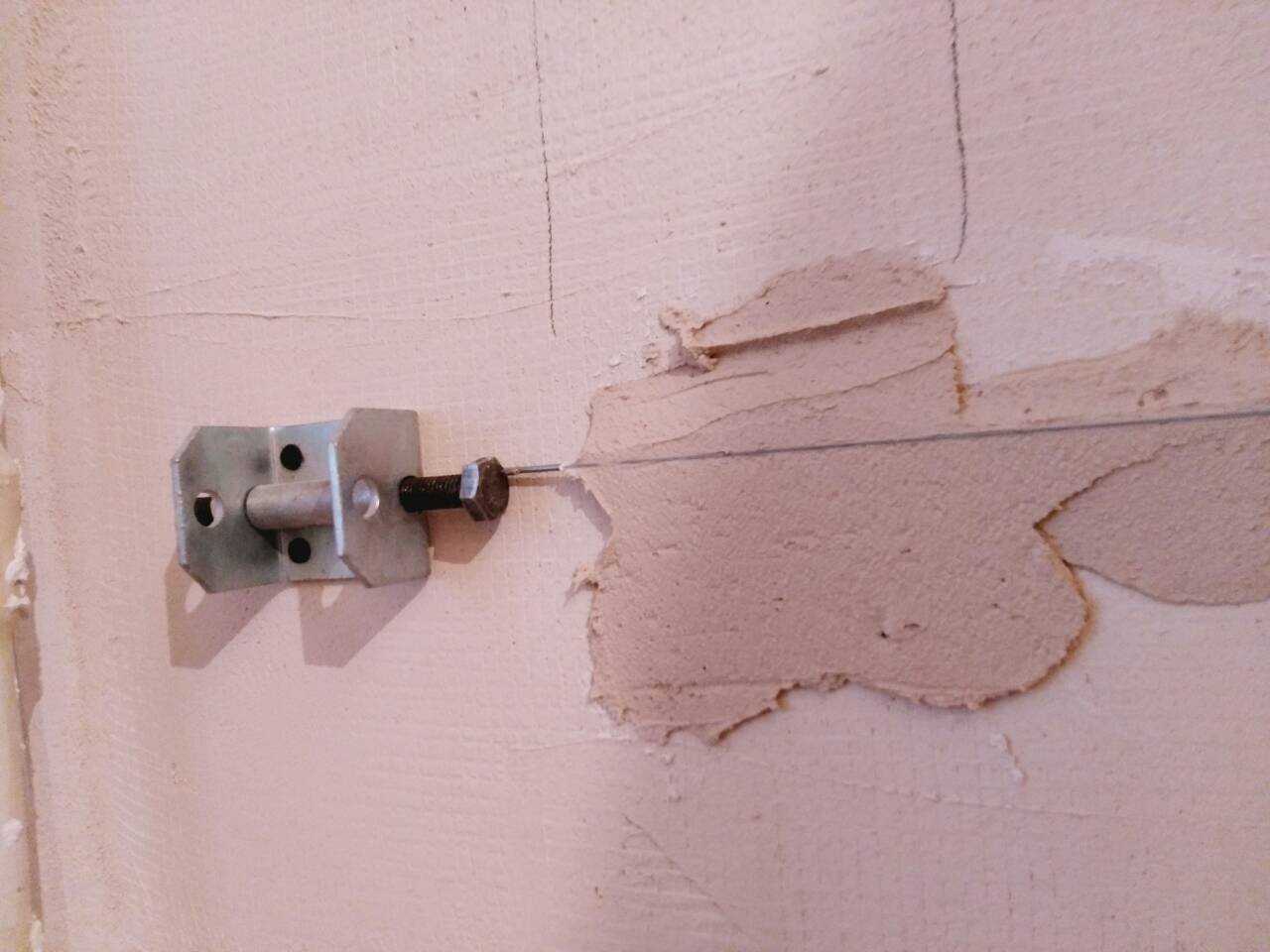 По горизонтали и вертикали протягивается шнур либо леска. Затем нужно определить самое выступающее место в стене. В промежутке между ним и натянутой леской нужно вбить саморезы.