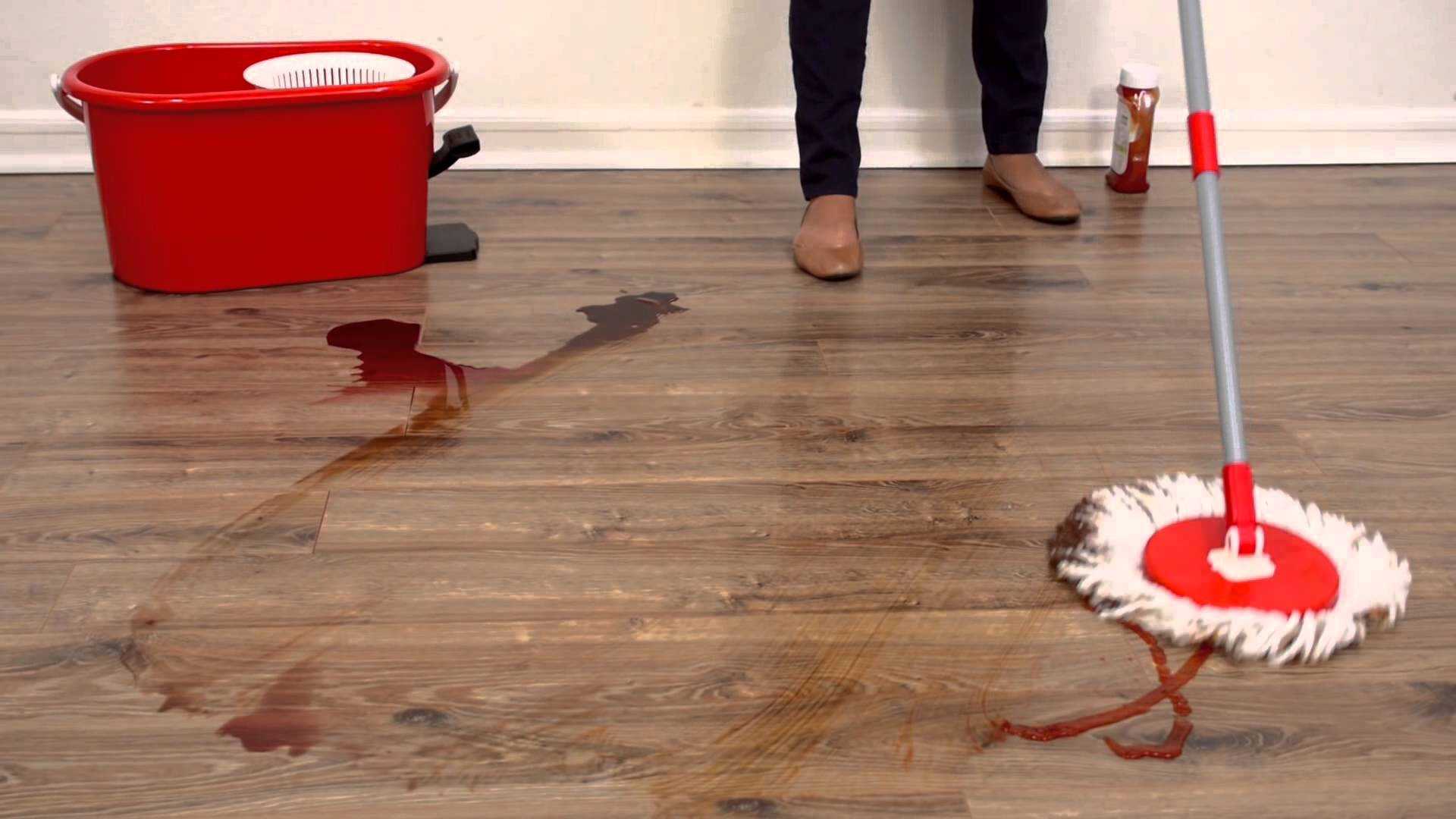 Жирные пятна нужно постараться быстрее вытереть моющим средством. После этого, промыть пол несколько раз водой.