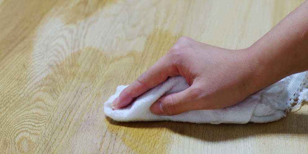 - Жир, попавший на поверхность напольного покрытия стирают салфеткой затем обрабатывают проблемный участок скипидаром с водой. Вместо этого можно использовать раствор обычного моющего средства. Загрязнённый участок протирают сухой ветошью.