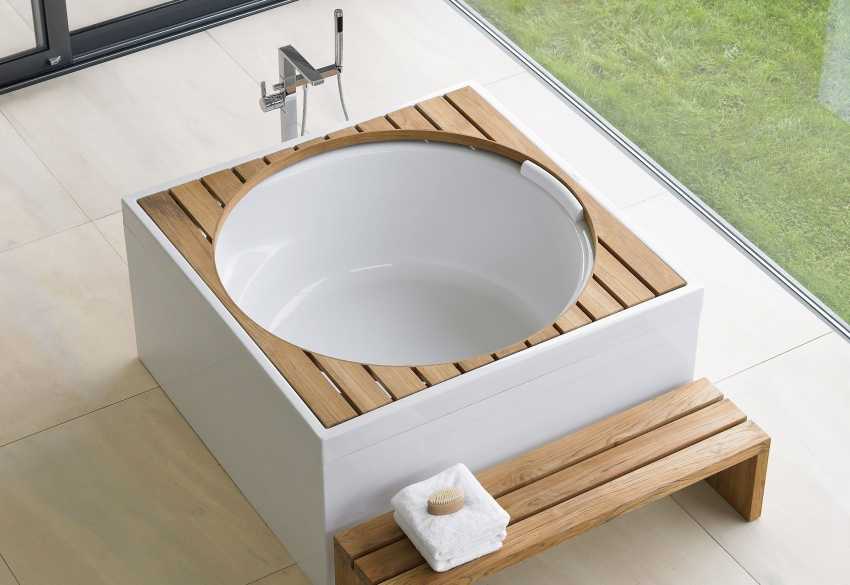Для небольших ванных можно использовать маленькую глубокую ванну круглой или овальной формы