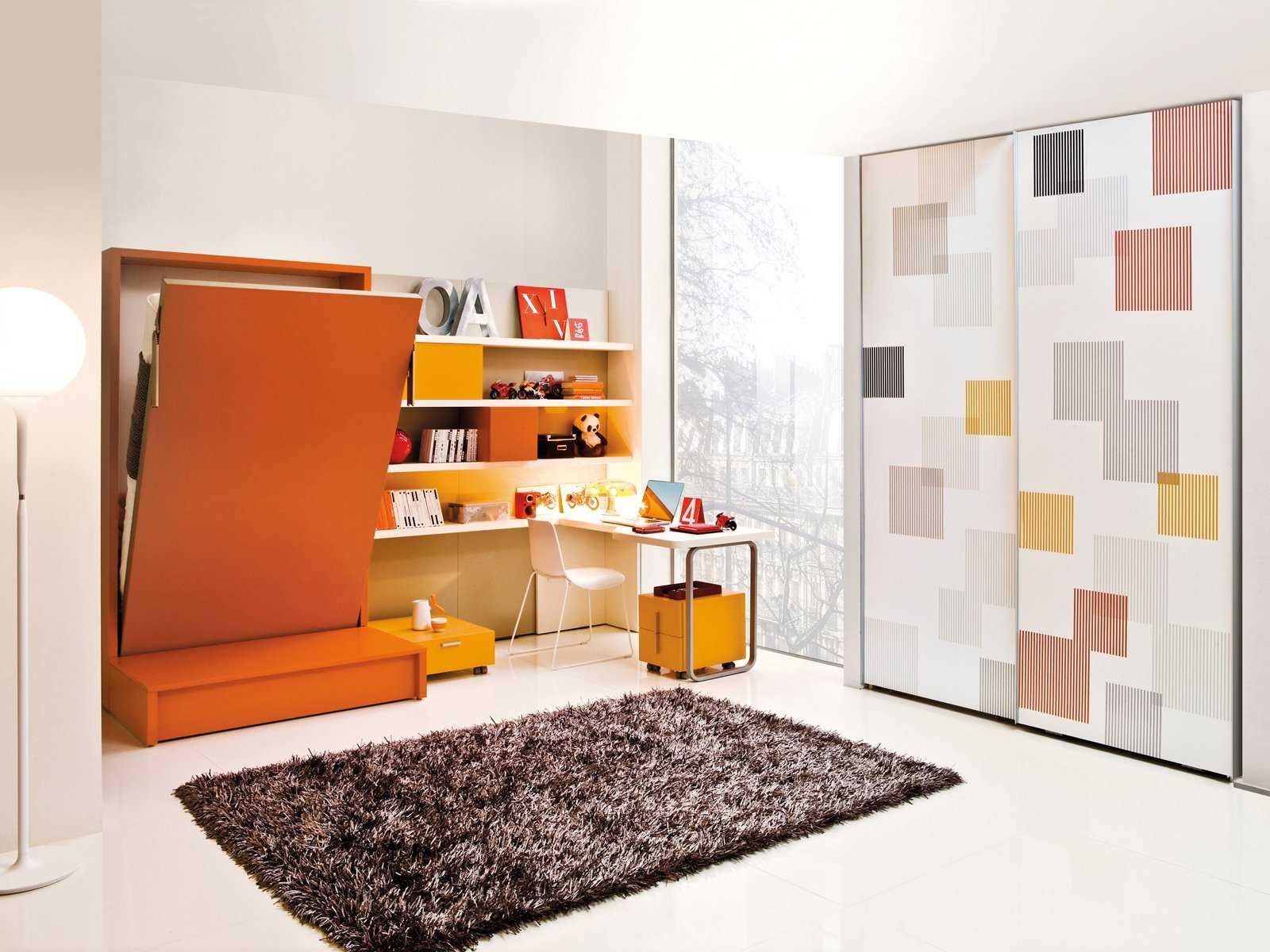 - подъемная кровать, встроенная в стенку шкаф или стол. Лицевые части шкафов превращаются в зеркальные панели, украшаются растительными или цветочными принтами, изображениями персонажей из мультфильмов;