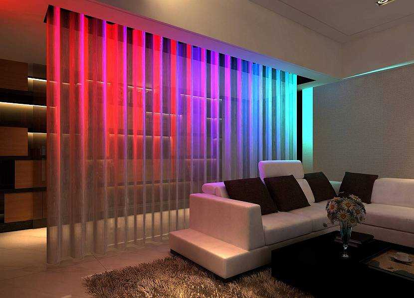 Зонирование комнаты шторой с неоновой подсветкойИсточник dizainvfoto.ru