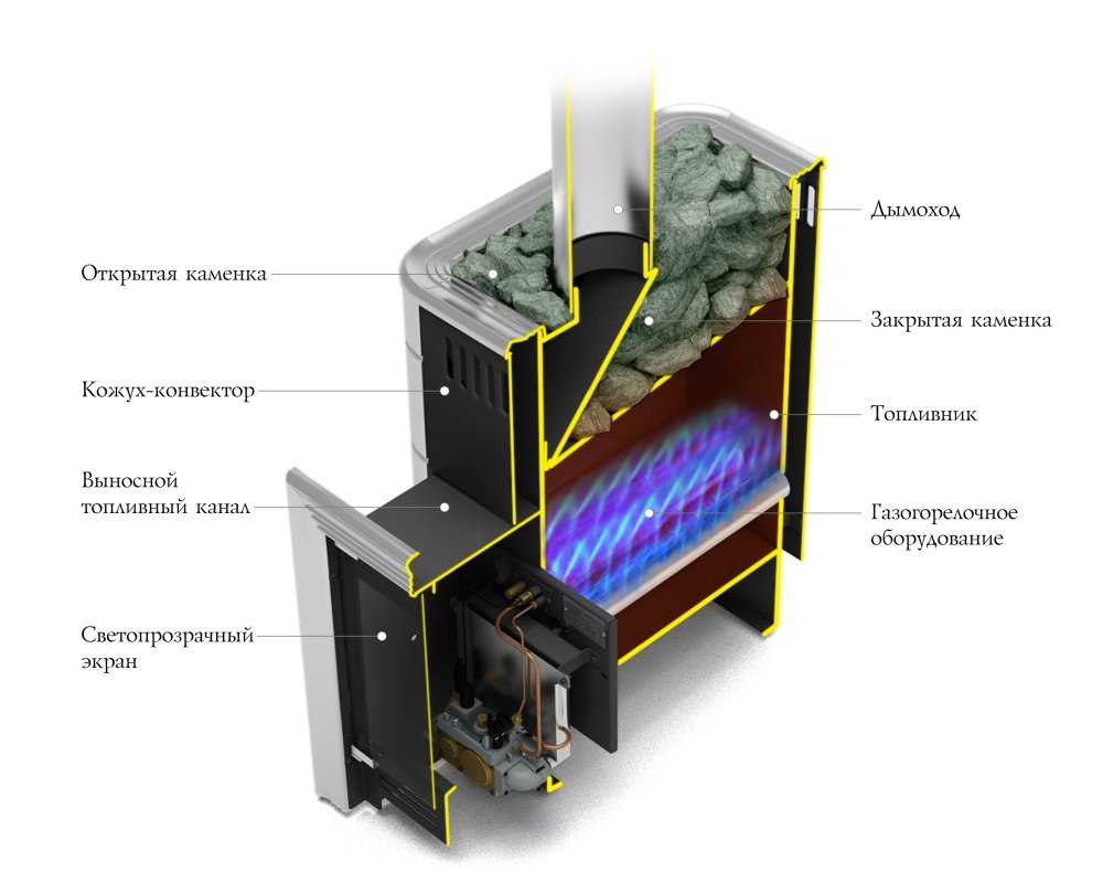 Как происходит нагрев, и куда выходит пар в каждом отдельном котле — на примере разных видов устройств с закрытой каменкой и открытой