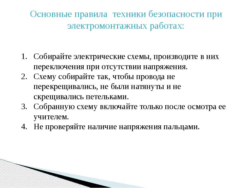 Как правило, все эти профессии непосредственно связаны с негативным воздействием электрического тока и для минимизации возможности проявления негативных последствий в обязательном порядке необходимо создание специального внутреннего документа и выполнение особых предписаний, которым и выступает техника безопасности при выполнении электромонтажных работ. Такой документ содержит перечень требований для поведения, а также разделы о безопасности осуществления трудовой деятельности в сфере правоотношений.