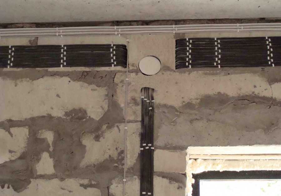 Одновременно в момент прокладки проводов в штробах, для защиты и обеспечения удобства дальнейших работ, проводку протягивают через гофру. Закрепив её в углублении по всей линии выемки, поводят штукатурные работы. Выравнивают места прокладки гофры и затем выполняют обычные отделочные работы (шпатлёвку и покраску или оклейку обоями).