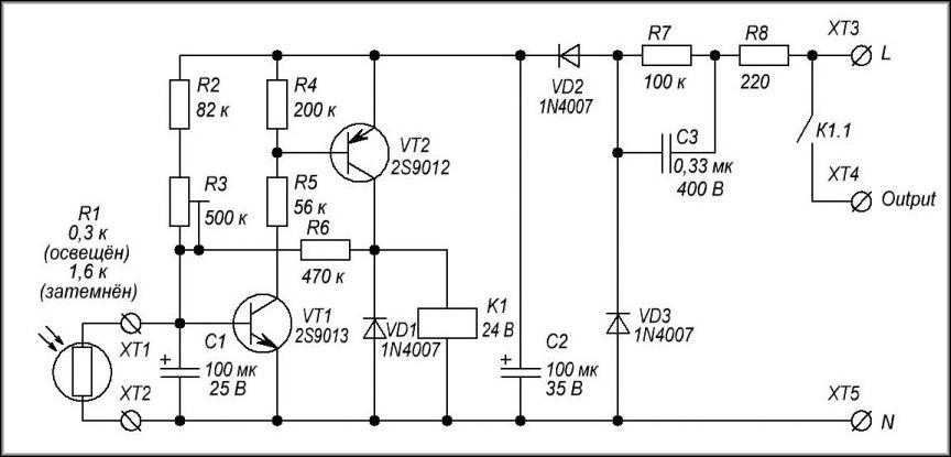 Для тех же, кто желает повторить управляющую часть фотореле для освещения своими руками, можно предложить следующую отлаженную практическим опытом схему, которая поможет в том, как правильно подключить устройство: