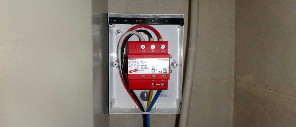 Устройство защиты от импульсных перенапряжений полностью обесточивает электрическую сеть дома при возникновении мощного индукционного поля, то есть вторичного поражающего фактора молнии. Модуль устанавливается в распределительный щиток по следующей схеме.
