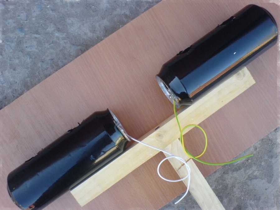 Закрепляем банки (с точки зрения теории радиоприема, теперь это симметричные вибраторы) таким образом, чтобы между торцами с кабелем было ровно 75 мм. Это оптимальный зазор для приема аналогового и цифрового телевидения.