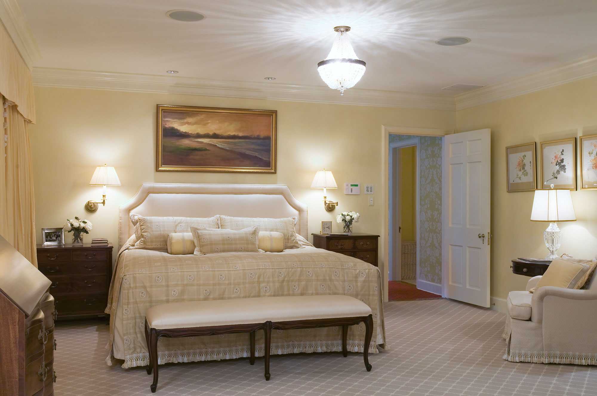 Стандартная высота размещения светильников в спальне – 210 см. Этот параметр может варьироваться в зависимости от конструкции кровати или физиологических особенностей человека.