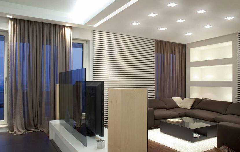 Дизайнерский прием подчеркивает декор, форму и размеры гостиной. В помещении используют игру тени и света, лучи разных цветов и температур