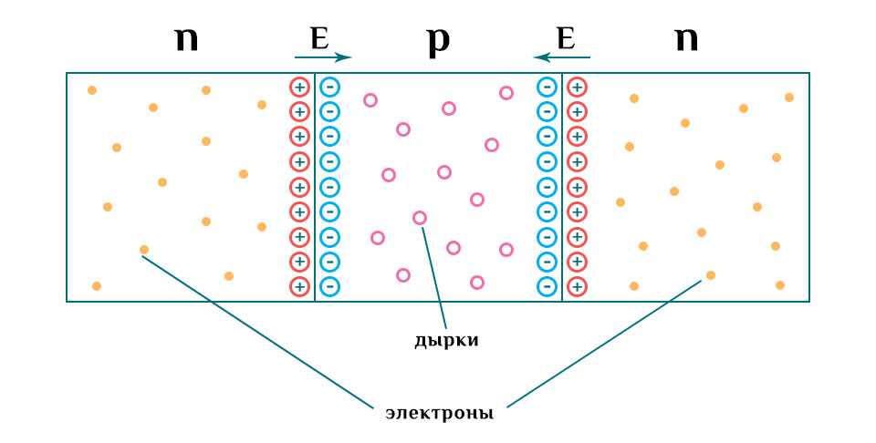 Если два таких материала приложить друг к другу, то в месте их соприкосновения образуется так называемый p-n переход. Дырки и электроны проходят через него, насыщая соседа. То есть там, где был избыток дырок, идет их заполнение электронами и наоборот.