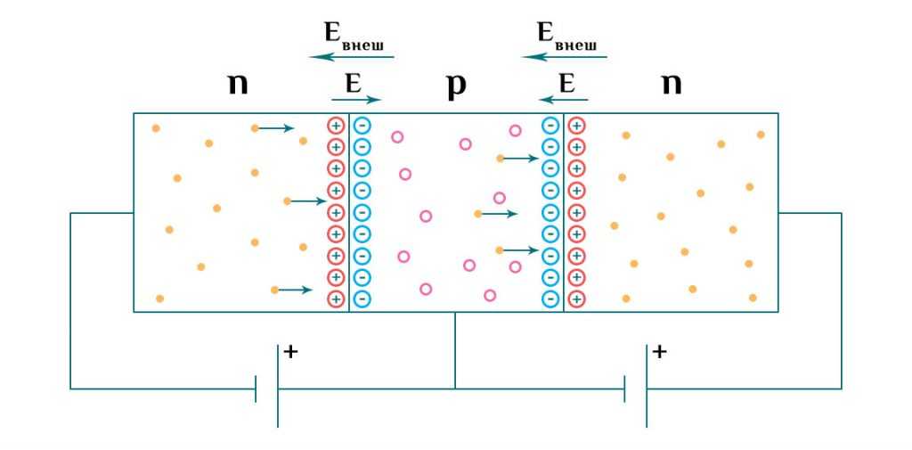 Когда проводники разного типа соединяются, между ними образуется р-п переход, благодаря которому электроны могут двигаться только в одну сторону. Подключив область «п» к минусу источника питания, а область «р» — к плюсу, можно создать прямое подключение, при котором электроны свободно передвигаются. Если полярность источника поменять местами, то электроны из электронной области уйдут к источнику, а прибор закроется, потому что граница р-п не даст электронам пройти через дырочную область.