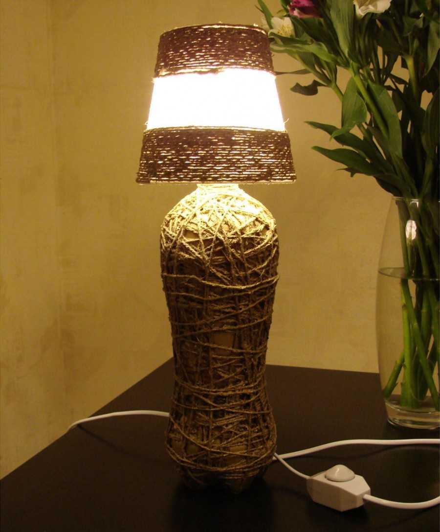 Форма бутылки при этом должна сохранить первоначальный внешний вид. Во внутреннюю часть поместите лампочки. Светильник, изготовленный своими руками готов. Для более привлекательного внешнего вида, можно использовать не одну, а несколько бутылок. Изделия выполняют аналогичным способом, меняя цвет шпагата, например.