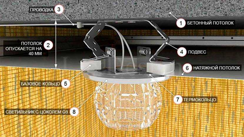 Схема монтажа прибора на натяжной потолокИсточник sense-life.com