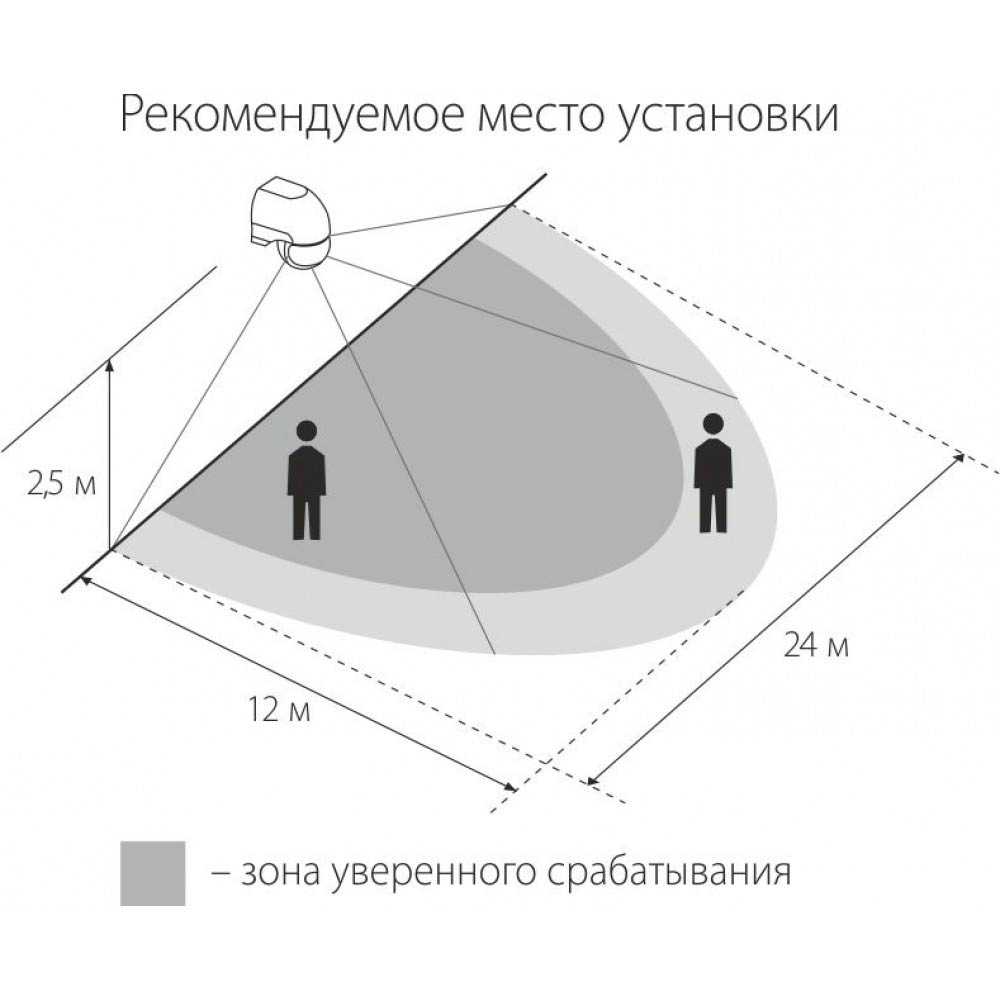 Есть также угол обзора по вертикали. В обычных недорогих моделях он составляет 15-20°, но есть модели, которые могут охватывать до 180°. Широкоугольные детекторы движения обычно ставят в охранных системах, а не в системах освещения, так как стоимость их солидная. В связи с этим, стоит правильно подбирать высоту установки прибора: чтобы «мертвая зона», в которой детектор просто ничего не видит, была не в том месте, где движение наиболее интенсивное.