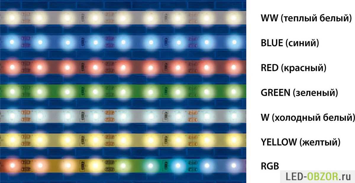 Ленты можно разделить по цвету свечения. Есть однотонные и многоцветные. Однотонные — это синий, красный, желтый, зеленый, теплый белый, холодный белый и нейтральный белый.