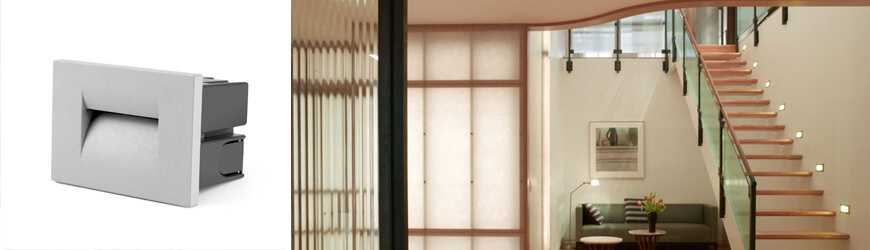 Если в доме есть лестница, не стоит забывать, что она тоже требует подсветки — это залог безопасности жильцов и гостей. Выбирают светильники, дающие рассеянный свет, с лампами малой яркости (1–3 Вт для светодиодных источников) — специальные светильники для лестниц (маркеры). Они освещают ступени или небольшое пространство вокруг себя; малая мощность светильников и направление светового потока в определенную зону не слепят идущего.