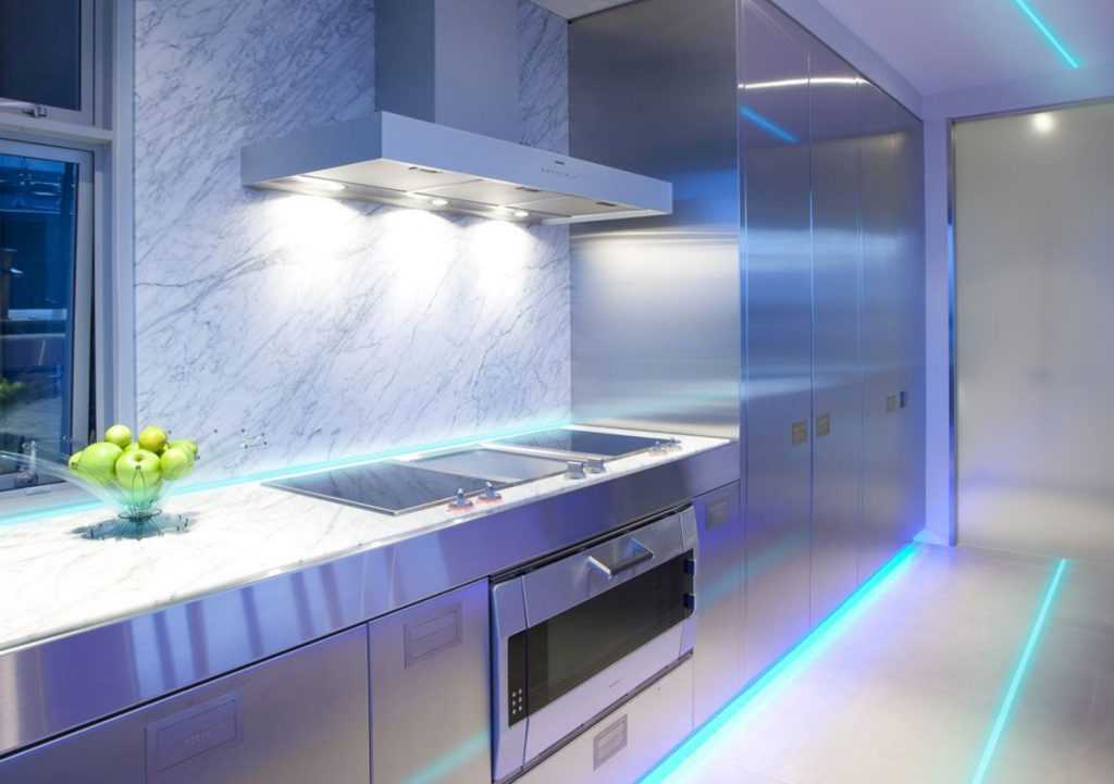 Подсветку можно обустроить внутри самой рабочей фурнитуры, а не у мебели. Можно выбрать стеклянные варианты фартука, который легко оборудуется светодиодными лентами.