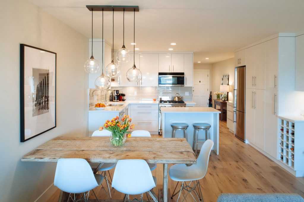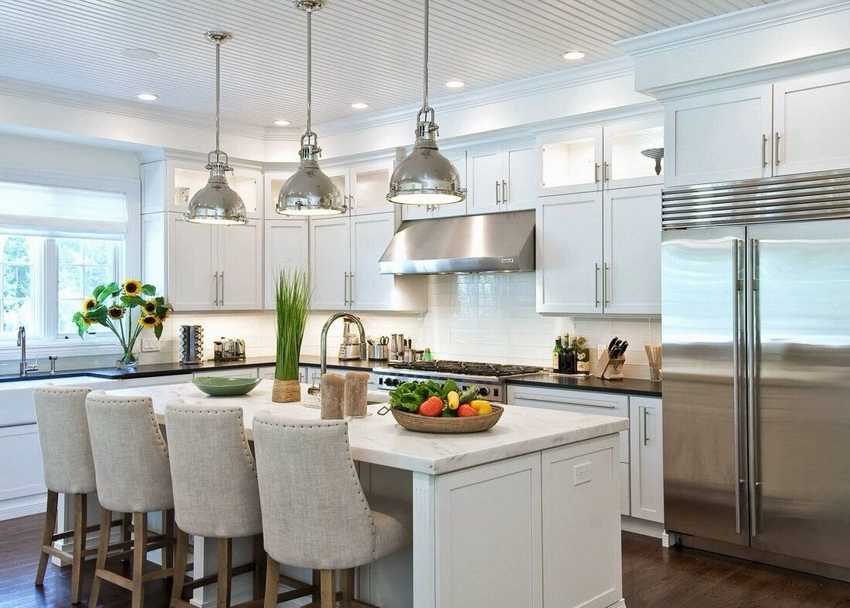 В длинных кухнях идею основного освещения можно поддержать рядом свисающих плафонов. Впрочем, в очень больших помещениях 4-5 расположенных в ряд светильника над обеденным столом помогут выделить столовую зону, даже если она находится не по центру.