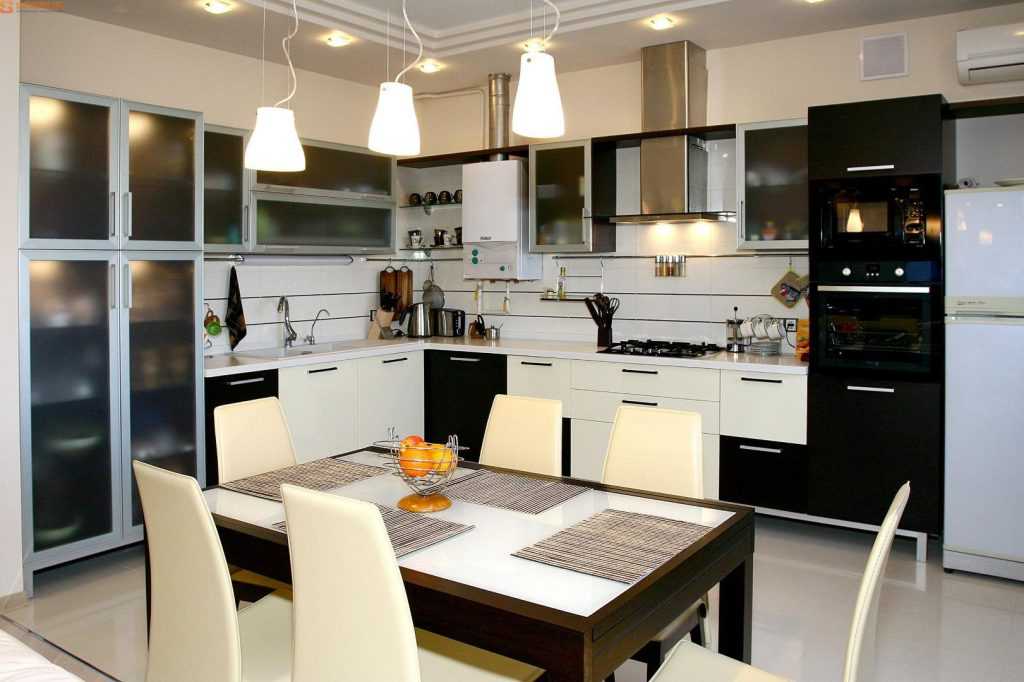 Но зонированное освещение кухни не исключает наличия люстры. Функциональное значение ее невелико, так как световое пятно получается в центре помещения, которое в основном остается пустым. Но с точки зрения выравнивания неравномерной освещенности такой способ очень неплох. Как вариант можно использовать несколько софитов, как на фото выше, или установить встроенные потолочные светильники, если потолок натяжной или подвесной из гипсокартона.