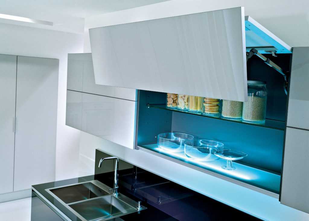 Отличное решение – создание навесных шкафчиков, на основе закалённого стекла. Потом их дополнительно оборудуют внутренней подсветкой. Такого света вполне хватит для обеспечения основных функций, и не будет выглядеть избито сам интерьер кухни, освещение смотрится весьма удачно.