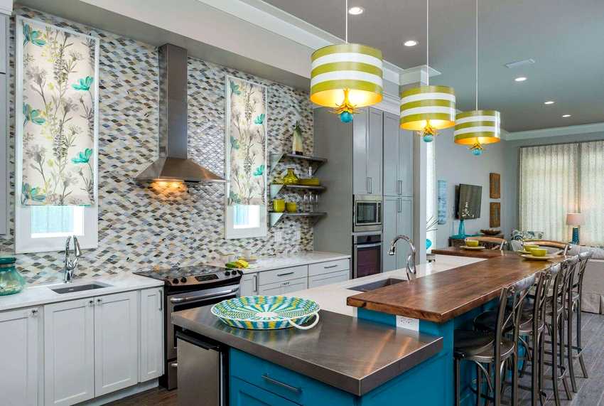 Островная. Любая из предыдущих расстановок мебели может быть улучшена с помощью острова. Он пригодится для сокращения расстояния между вершинами в большом пространстве или для прокачки прямого гарнитура. В дополнительном модуле проще всего расположить варочную панель, она не требует проведения коммуникаций.