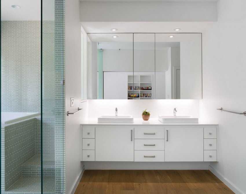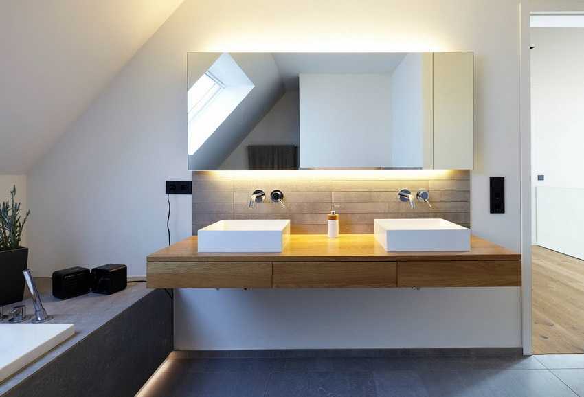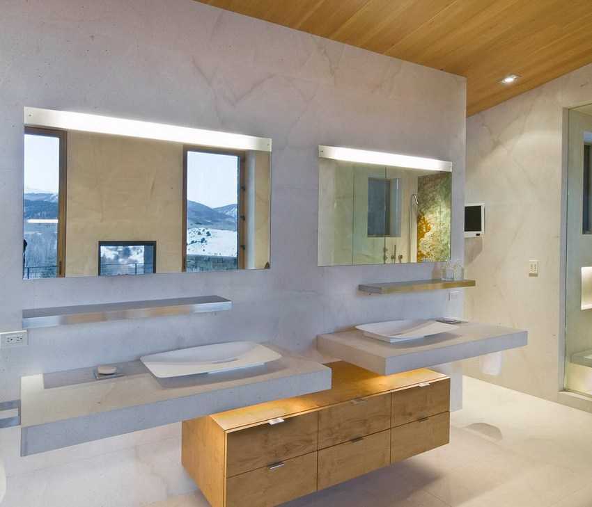 При наличии большого зеркала светильники могут крепиться прямо к стеклу, и свет будет приумножаться за счет отражения. Если два зеркала: над раковиной и над ванной, то, что над раковиной, должно освещаться открытым прямым светом с широким углом рассеивания, а то, что над ванной – скрытым светом, пущенным за выступом потолка или со специального карниза, ниши. Можно сделать декоративную стеклянную или зеркальную стенку прямо за ванной, «разбросав» светодиодные светильники по ее поверхности.