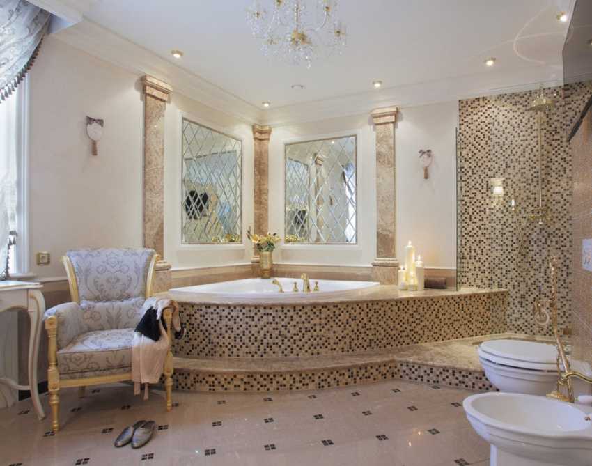 Хрустальные модели люстр, как правило, приобретают для интерьеров ванных, оформленных в классическом стиле.