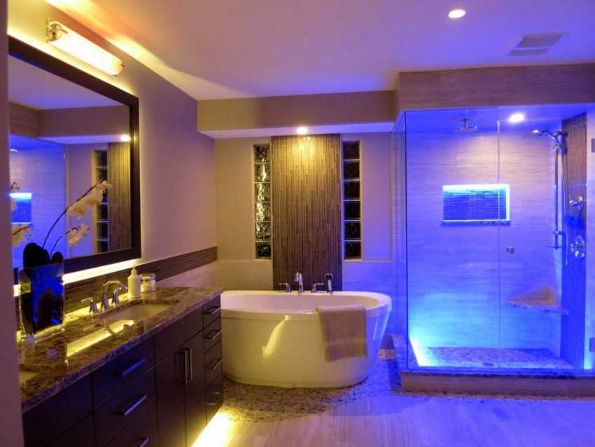 Третий уровень выполняет функцию декоративного освещения и необходим для создания расслабляющей интимной обстановки. Это могут быть готовые источники светодиодного света, встроенные в душевую кабинку, ванную. Или проекты, выполненные на основе светодиодных лент RGB, позволяющие задавать яркость и цвет излучения по собственному настроению.